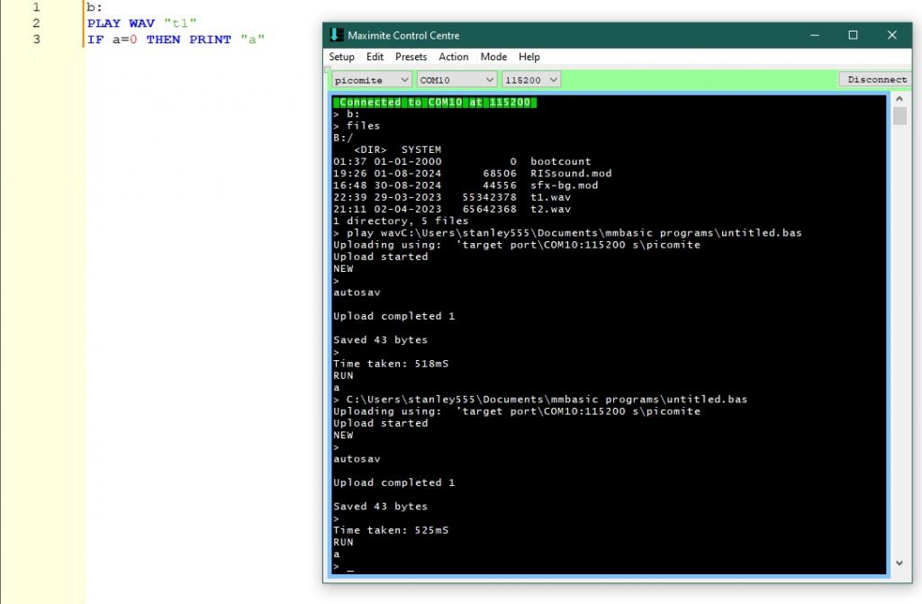 Hi Peter, There is a serious issue with PLAY WAV on RP2040 VGA 6.00.01rc9 On the commandline you can type PLAY WAV "yoursong.wav" and it plays. In a program you can not. Below is a minimal code to show the problem. It uses the tetris sound for Blocks. PLAY WAV "tet16cut.wav" if a=0 then print "a" This errors with "Error : IF without THEN" and does not play any sound. Volhout Edited 2024-12-22 06:58 by Volhout PicomiteVGA PETSCII ROBOTS |