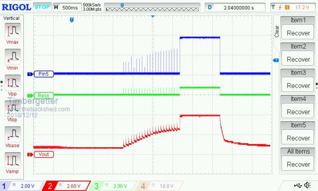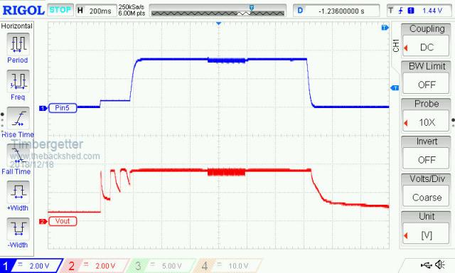 I have done 2 things that seems to have improved things somewhat: 1. Made the pull-down resistor for ATmega328P’s output pin D5 more aggressive by changing value from 10k to 4.7k. 2. Reduced the R7 resistance going from pin D5 to the base of Q10 from 1000 ohms to 470 ohms. (refer to Grogster’s suggested circuit on upper part of Page 2 of this thread) These two adjustments seem to allow the supply voltage to drop down to around 4.0 volts before the ATmega328P’s pin D5 hangs high. (It was 4.55 volts per my previous post). I was hoping to get it to continue operating down to around 3.7 volts to squeeze the best out of the 3 AA batteries, but at present the operation is unstable down there. I am observing something on the DSO traces that I don’t understand but I suspect it might be a clue as to what’s going on. The Atmega pin D5 goes high for 1 second to carry out the waking duties. However for about 1.5 seconds prior to that pin going high there is a succession of spikes at intervals of 68 mSecs. These spikes seem to give rise to an increasing voltage for Vout (the output of the MosFet) which climbs to about 2.6 volts before switching on properly to about Vsupply. The traces below are for a Supply of 4.0 volts. When the Supply is up at 5 volts I get a similar ramping effect but not as pronounced. (it persistes for only 0.9 seconds rather than 1.5 seconds). Does any of this make sense to anyone? ![]() |
