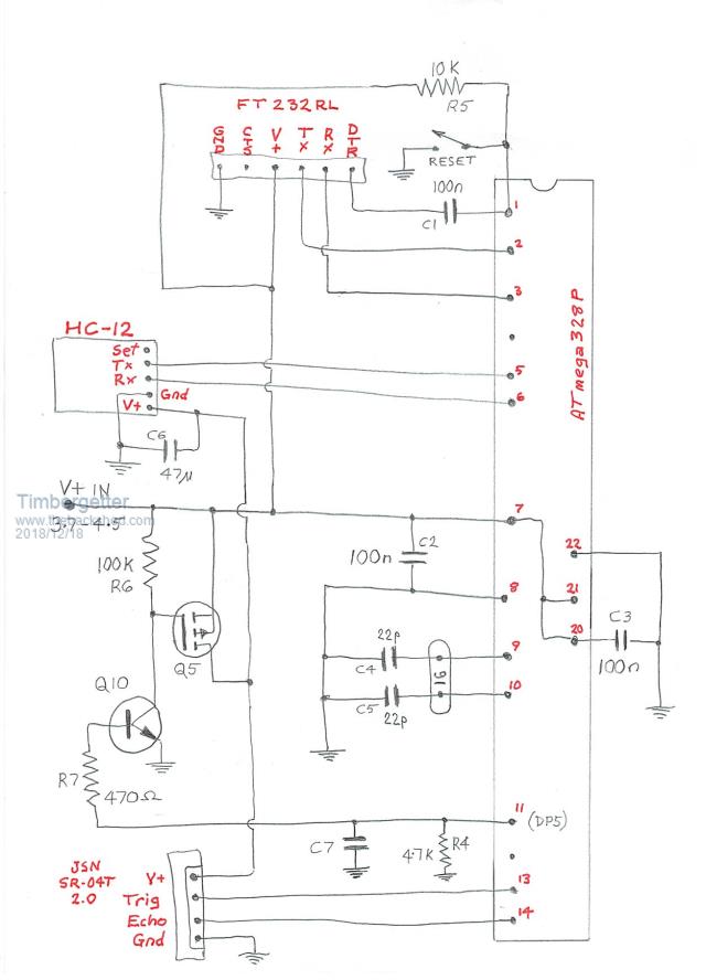 Hi again Timbergetter, I confess that I have not been following this post. Arduinos and C are not my thing but the circuit caught my attention. I have read the whole post now. In addition to my previous suggestion, if the unexplained pulses are still there you could try a 100nF capacitor from the transistor's base to ground to filter them out. One could also be handy across the power supplies to the ultrasonic detector and the HC-12 as well - also try your 470uF capacitor across the incoming supply. Good Luck Bill Keep safe. Live long and prosper. |
