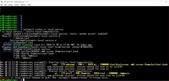 Yep Tried it all I just this second deleted the .options again made sure autorun was off started screen loaded MM CTRL Z to exit MM then sudo shutdown -r now so the Pi rebooted After it rebooted I opened Terra Term again SSH'd to the Pi typed systemctl status rc.local.service and I got the exact same as before I then typed screen -r and I got "there is no screen to be resumed." |