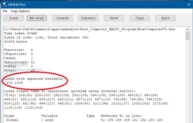 Try again - the bug has been squashed. I have made another big improvement in processing time. My test BAS file went from 466mS down to 190mS C:\Users\Jim\Documents\apps\maximite\Boat_Computer_BASIC_Program\BoatComputerV4.bas Time taken 187mS Lines of code: 1162, Total variables: 250 Functions: 6 CFunctions: 0 Csubs: 1 Subroutines: 21 Fonts: 0 Total: 28 I was scanning through an array looking for existing variable names. This was slow so I tried keeping a long string with the new variable names getting added as they are found. It is much quicker to do an INSTR to find existing strings than step through an array. By padding the names to fixed length, it can also return the index to the array without any extra work. You just need to be able to handle long strings. That was the most impressive speed improvement. The others involved changing IF...ENDIF..IF...ENDIFs to IF...ELSEIF...ELSE...ENDIF etc to reduce redundant code sections. I now also check for "CM" etc in TEXT alignment and don't report it as a variable. 2019-01-29_063445_MMEditPlus.zip Jim VK7JH MMedit |