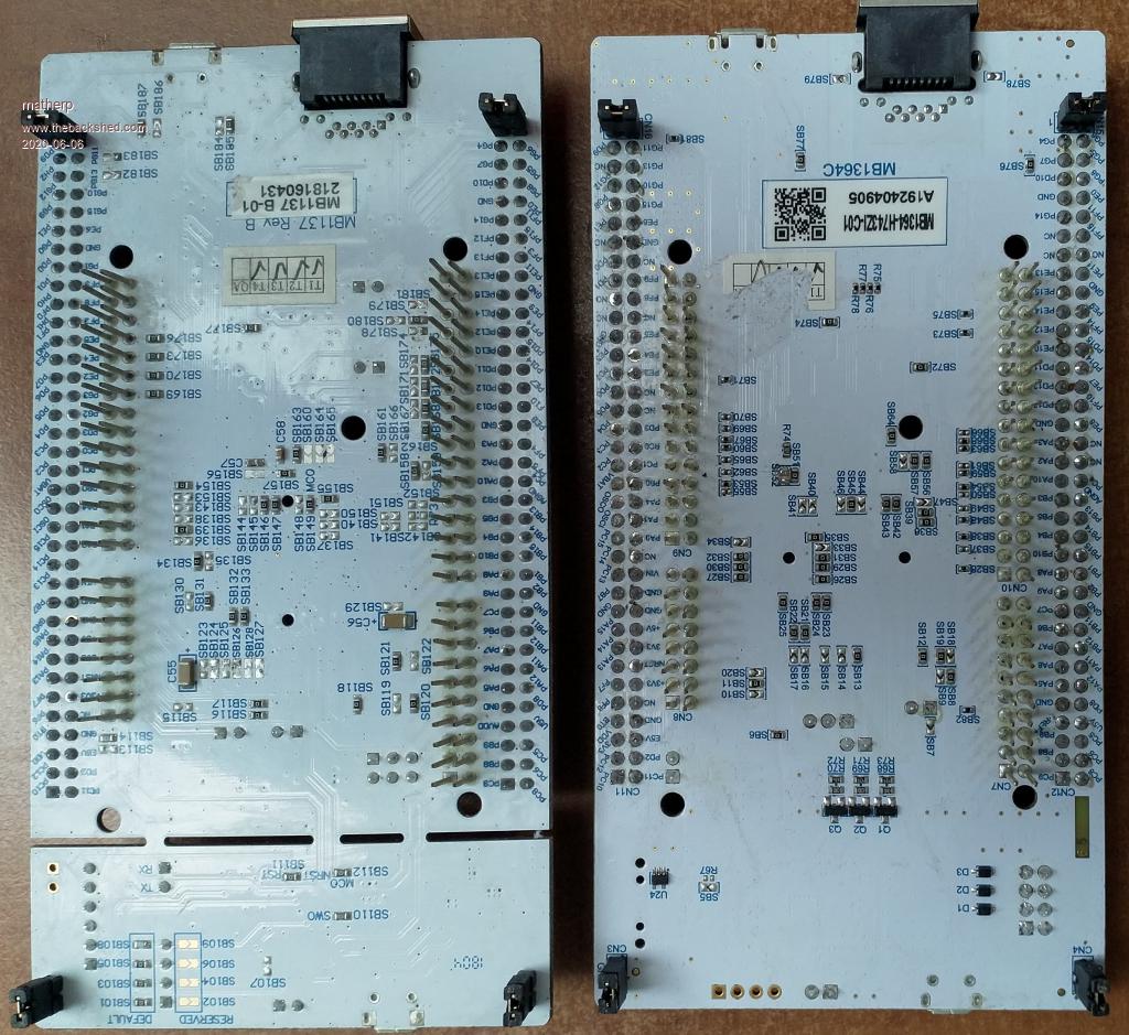 John Not sure which version you mean but pics of my board attached, both tested with RC18, both work, both verify properly if H/W reset selected in STM32CubeProgrammer. After programming disconnect ST-LINK and press RESET. You should be using the ST-LINK VCP as the console unless you disconnect it it will conflict with direct connection to the pins ![]() ![]() Edited 2020-06-06 01:13 by matherp |