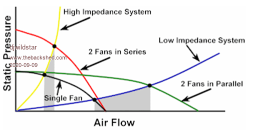 [B jpusztai]- Awesome case idea! The Sol-20 and Apple //c were both on my mind as I was designing my case for the CMM2. I'm a southpaw, so I decided to put the card slot on the left. @vegipete - Air intake filters and positive case pressure are great at keeping dust and lint (and cat hair) out of the inside of the case. If you're going to use air filters, positive pressure is the way to go -- it is otherwise impossible to put filters over all of the possible air-entry-points in the case. If you want to set up the fans in a series configuration (one blowing in and one blowing out), I'd suggest moving one of them. It wouldn't be hard to place them on opposite sides of the back panel and arrange a baffle that directs incoming cool air over the CMM2 and ensures that outgoing air is drawn over the amplifier. I went with a parallel configuration because that provides for a nearly-linear relationship between the impedance of the case and the overall airflow (the green line between the yellow and blue lines in the attached chart). It also made it easier to direct where the cool air went, since I could drill intake holes in the bottom directly underneath the CMM2 and amplifier rather than having to set up baffles inside the case. |
