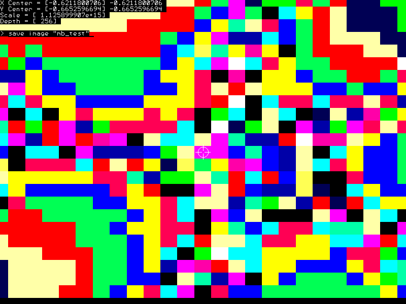 Interesting! I wouldn't have thunk it possible. I guess I've never zoomed in to 1,000,000,000,000,000 X before? I'll do some more playing with this later. The coordinates in brackets are for the current view and the second set of X,Y coordinates is for the current cursor position. Also I just notice that the "C" command key for re-centering on the cursor position never made it to the help screen. It has been working all along and I will add it to the help screen in the next version. -Carl |