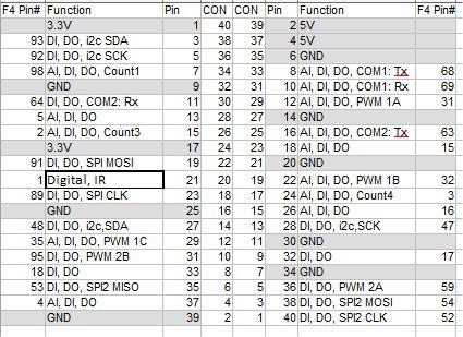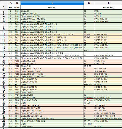 Sorry only got it on paper.its like this. Screen This Side of Pins ------------------------------------------------------------------------- | The 32 Pins on the Armmite board looking from the top. | | | 3.3 N/C PEN-IRQ MOSI TCLK DC RD B1 B3 B5 B7 B9 B11 B13 B15 GND | GND GND LCD-BL MISO T-CS CS WR B0 B2 B4 B6 B8 B10 B12 B14 RST | | | The 34 pin connector that will take the LCD. looking from top. | |T-CS PEN MISO GND VCC BL B15 B13 B11 B9 B7 B5 B3 B1 RST WR CS |CLK N/C MOSI N/C GND VCC N/C B14 B12 B10 B8 B6 B4 B2 B0 RD RS -------------------------------------------------------------------------- staight mapping for B0-B15, GND, WR,RD, CS, RST, T-CS, MOSI, MOSI CLK to TCLK BL to LCD-BL RS to DC PEN to PEN-IRQ 3.3 to VCC The only thing to consider would be if some LCDs are nor logic driven on the BL pin, then might need a option to either connect to LCD-BL ot to 3.3v The ones I looked at use BL to switch a transistor, so logic level connect to LCD-BL is OK. F4 H7FotSF4xGT |