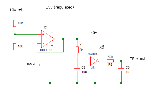 no worries, not annoyed at all - your feedback is very much welcome and appreciated. the recommendations on the EEVblog metrology forum seem to be to keep the switching frequency relatively low. Andreas on EEVblog suggests 300Hz to aid in rejection of both 50Hz and 60Hz mains. i rather like your idea of using an opamp to buffer the 10v, conveniently at the same time it can be halved to 5v which makes using a 74HCU04 easier: ![]() (edited from schematic in EEVblog posting linked to earlier, "TRIM out" goes to trim pin via a high-value resistor) i can always use a second PWM channel to provide a second trim voltage through an even higher feed resistor if needsbe, thereby achieving more effective bits of resolution. the schematic i borrowed above uses 50k, it just needs to be a couple of orders of magnitude less that the associated high-value resistor. remember that we are only wanting to shift the trim pin a very small amount. i would rather not use the MX170's PWM output pin to drive the resistor/capacitor directly, as there is still quite some electrical noise on the PWM pin. the use of a CMOS logic chip running from the reference voltage seems to be a trusted approach to mitigate this. 'professionals' replace trimpots with fixed-value resistors after calibration! but will address that one when i get to it. cheers, rob :-) |