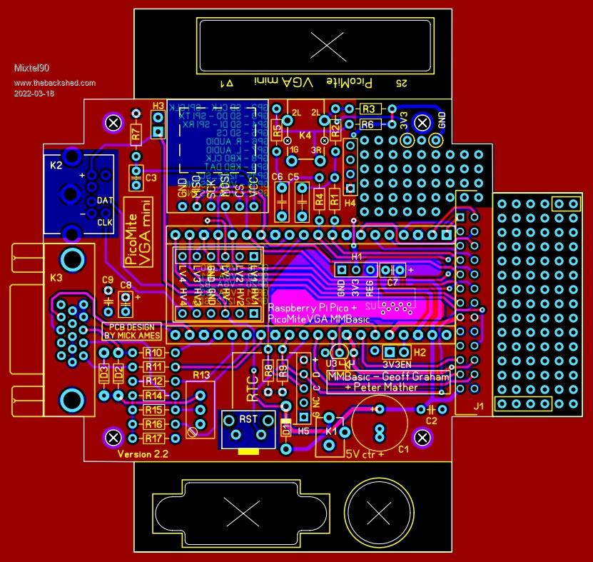 If what you want is a small (80x65mm) board to take a PicoMite VGA, then I already have a design - but it's the existing VGA system, not some enhanced version so sorry, no Doom. If you need more IO then just leave some of the other stuff off. :) You can do the same with Peter's (more expandable and a little larger) design. PicoMiteVGA22_gerber.zip Mick Zilog Inside! nascom.info for Nascom & Gemini Preliminary MMBasic docs & my PCB designs |