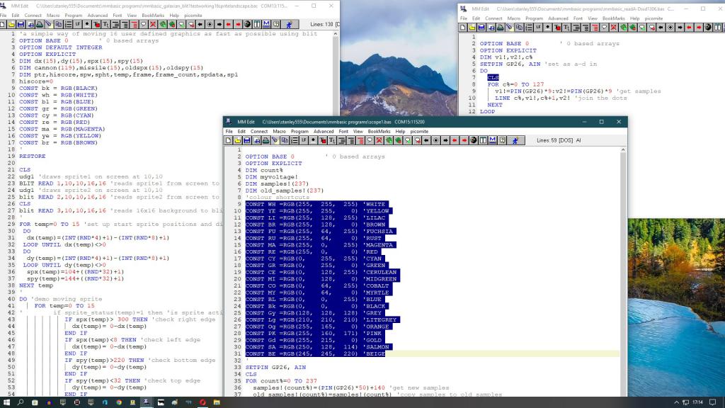 Mik, I am liking mmbasic, It is all new and shiny and easy enough that even I can use it, The built in editor which I use with teraterm is totally new, It is a small screen and make full screen loses the f1,f2, info panel. I have spent hours trying to use it and still it is a pain to use. Someone said they go icon blind using mmedit. and me. but it so familiar to use. I have no connections with the author of mmedit but it is an alternative for win users. notepad++ or geany no, not setup. |