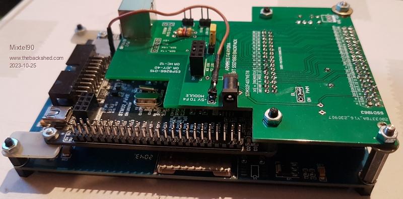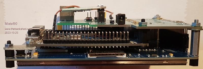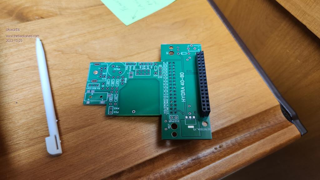 Ah, you've assembled it wrong. :( The display connector goes on the bottom of the board in your photo, so both connectors are on the same side. This sounds weird until you look at he final assembly. These pics are of the prototype. As I said, I haven't got an IPS display or a Hydra 40-80 board. It's the same idea though. The shape of the Hydra board lets you get to the pins of the Armmite F4. ![]() ![]() The component silkscreen goes to the top of the assembly when the display is lying face down on the table, as shown in your pic. ----------- 5V from the Armmite F4 is best picked up from the serial port connector 5V pin via a link wire to the serial port on the Hydra. (Innermost pin, next to the diode, between the PS/2 and audio connectors). With this connection in the whole system is powered from USB. This is the brown Dupont wire shown in the pics of the prototype. ------------- Spacers used in the above assembly are 5mm (6 off) for the end and front, 11mm (2 off) for the F4-Hydra join and 18/19mm (2 off) for the Hydra-display join. I used 18mm for the latter but had to pad it a little with washers to get the F4 parallel to the display. . Edited 2023-10-25 17:34 by Mixtel90 Mick Zilog Inside! nascom.info for Nascom & Gemini Preliminary MMBasic docs & my PCB designs |