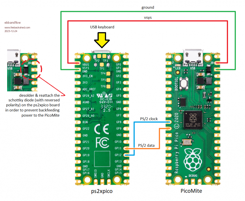 Well, I have a USB keyboard > ps2x2pico > picomite running on my desk and I'm quite pleased! I downloaded and flashed the ps2x2pico as outlined here: https://github.com/No0ne/ps2x2pico#usage but I wired it up as shown below. Now that it's working I plan to experiment with reversing the diode (per my previous post) and joining vsys of the picos together instead of vbus.![]() Edited 2023-12-25 03:28 by ebbandflow |