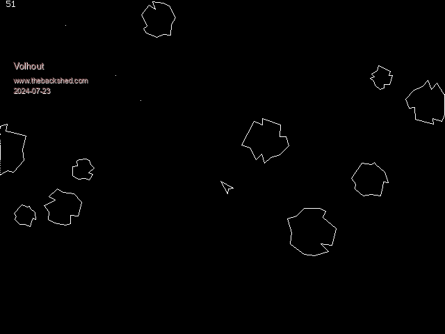 imho 16 ship rotations and draw it.not all that data. makes thrust different but missiles only 16 directions. original arcade game seemed simpler. collision checking is 4 checks per shape,.. maybe test pixels. nice job your doing, lots of new commands I've not learnt yet. |
