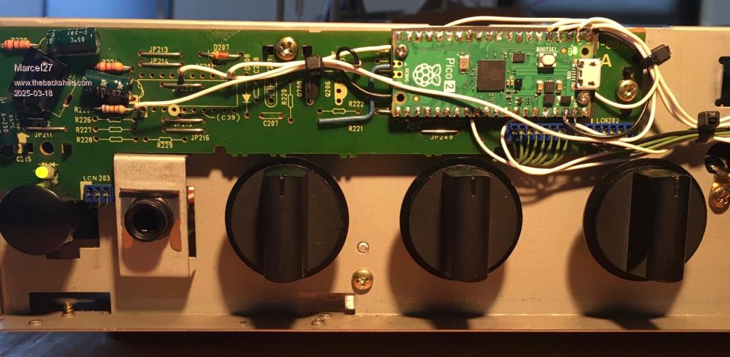 I would have liked to do the wire wrapping but decided against it because the pins were too long. Neatly built in. For me, good is good enough. I mounted the IR sensor on the original board, pin compatible, added the 180 kOhm to the senor output and ground to adjust the input voltage for the Pico 2. Added a diode in series with the +5V line to the VSYS input in case you connect an USB cable and added some jumpers to get signals at the right places. I discovered that when the amplifier is switched off there is still 5V on the Pico. So that thing is always thumping. |