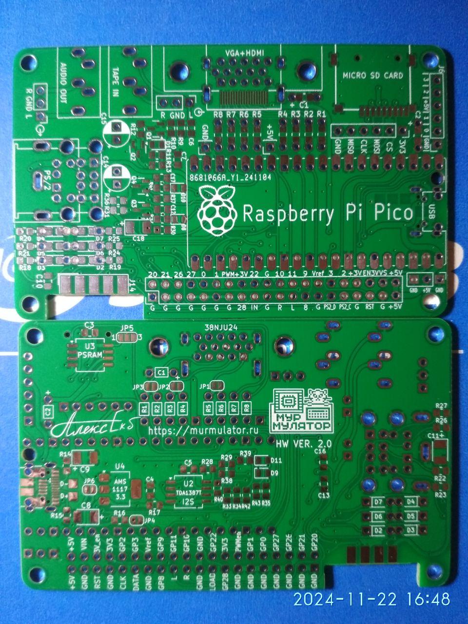 I checked the operation of the latest PicoMite HDMI firmware on the Murmulator2 board with a parallel-connected VGA monitor connector. ![]() Despite the crooked layout of the HDMI video pins of the HSTX Murmulator2 board and the parallel-connected VGA interface, it works perfectly at a high HDMI resolution of 1024x768 |