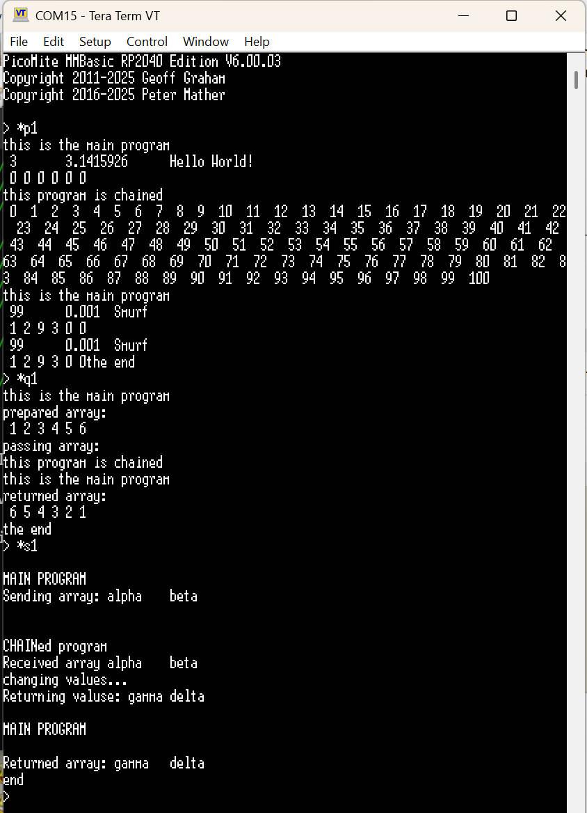 That means it is the rp2040 firmware on the Rp2350 or visa versa. Check you are using the second zip I posted not the first. NB: I think I have found a workaround for the CHAIN issue declare a dummy string which you are not going to use before any other variables e.g. for Mick's test Print Print "MAIN PROGRAM" If MM.CMDLINE$ <> "chainret" Then dim dummy$ Dim a$(1) = ("alpha", "beta") Print "Sending array: ";a$(0),a$(1) Chain "a:/s2.bas" EndIf Print "Returned array: "; Print a$(0),a$(1) Print "end" Please check this and confirm for me. Assuming all OK I'll try and find a proper fix | ||||