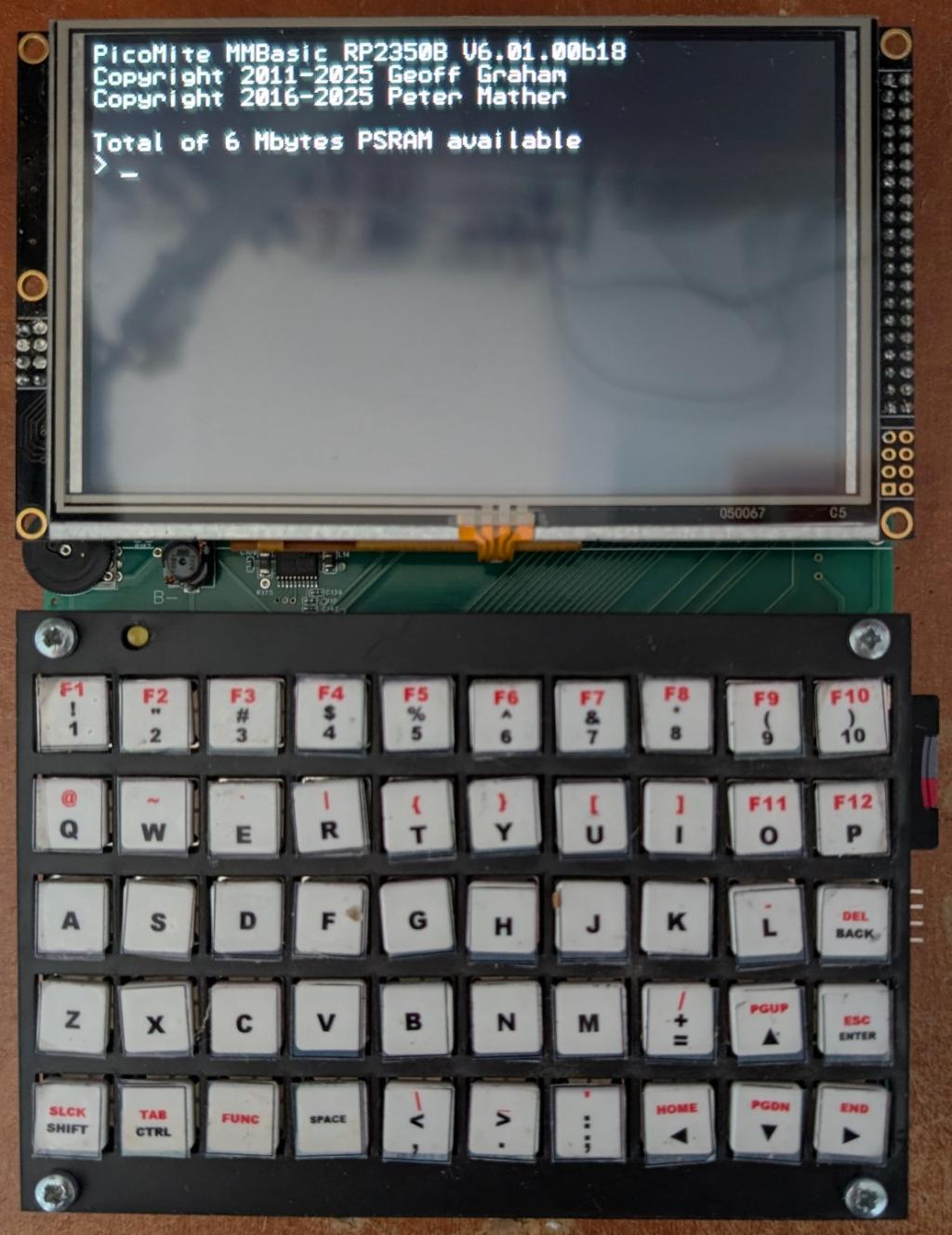 I like both thoughts. The display driven in the low resolution is good for compatibility and the gaming use case. And with 800x480 and 100x40 characters in Font 1 it is no problem to edit a bigger program with some line length without loosing the overview. I have two PGA2350 and both run super solid @360MHz and when ordered from Germany, the delivery took like only 5 days and 12,50€ each. The keyboard is great! Best wishes and success! Edit: Will the new driver replace Option LCD320 and will it go into RP2040 firmware? Edited 2025-09-04 03:09 by dddns |