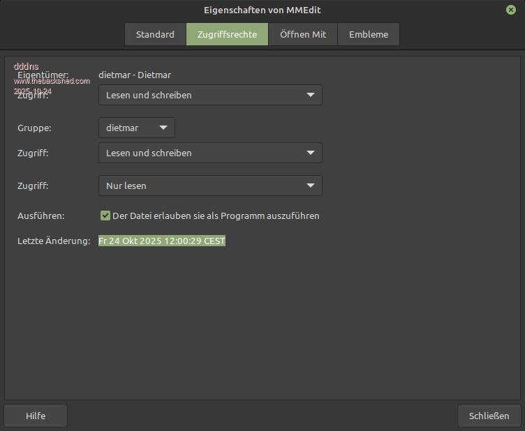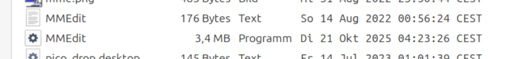 I think it has a different inode and as you see his filemanager makes a difference between these two. But don't want to discuss that now.. What I wonder about is, that I downloaded Jim's package and extracted it and double click on MMEdit binary and it just starts. With correct permissions and executable. @Wolfgang: Where did you download it from or does it run already for you? edit: @robert.rozee I think both are not correct, MMEdit text file and MMCC.desktop Beside the filename the content is not suited. Edited 2025-10-25 00:07 by dddns |