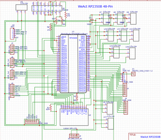 Ok, here's my first pass at a PCB for this module: $6.15 for 5 from JLCPCB, including shipping and sales tax, no tariff mentioned. ![]() ![]() It may well need a V2 (and V3). Gerbers, zipped EasyEDA, & module files attached. It uses an LCD (ILI9341 or ILI9488), a 5-pin RTC module, an SD module, an ESP8285 module, and optionally a VGA connector module. Provision is made for a 4-channel relay module to be plugged in. I don't know which pin is used to address PSRAM. WeAct-RP2350B-48-pins_V1b.zip ~ Edited 2026-02-09 04:11 by lizby PicoMite, Armmite F4, SensorKits, MMBasic Hardware, Games, etc. on FOTS |