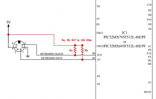 Lads, I suspect this problem is two fold. Firstly, we have `weak internal Pull-ups'. I looked through the PIC32 data and could not find the value of these weak pullups.. I suspect they may be in the order of 40k or 50k Ohm. And Secondly, these will be pulled up to only 3.3V not 5V. We are interfacing a 5V logic k/b to a 3.3V logic MCU. As the keyboard is open collector it requires pull-up resistors to guarantee a strong drive output. I propose a mod like the following (at least to those who experience a problem) 4k7 to 10k OHM resistors added from 5V to the CLK and DATA lines of the PS2 socket.
