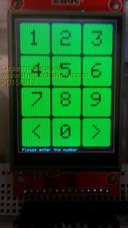 I9341.fillscreen(black) I9341.drect(0, 0, 240, 320, red) I9341.frndrect(10, 10, 70, 70, 5, green) I9341.pstring (30, 25, "1", 5, 0 , black, green) I9341.frndrect(85, 10, 70 ,70, 5,green) I9341.pstring (105, 25, "2", 5, 0 , black, green) I9341.frndrect(160, 10, 70, 70, 5, green) I9341.pstring (180, 25, "3", 5, 0 , black, green) I9341.frndrect(10, 85, 70, 70, 5, green) I9341.pstring (35, 100, "4", 5, 0 , black, green) I9341.frndrect(85, 85, 70, 70, 5,green) I9341.pstring (105, 100, "5", 5, 0 , black, green) I9341.frndrect(160,85, 70, 70, 5,green) I9341.pstring (180, 100, "6", 5, 0 , black, green) I9341.frndrect(10, 160, 70, 70, 5,green) I9341.pstring (35, 170, "7", 5, 0 , black, green) I9341.frndrect(85, 160, 70, 70, 5,green) I9341.pstring (105, 170, "8", 5, 0 , black, green) I9341.frndrect(160, 160, 70, 70, 5,green) I9341.pstring (180, 170, "9", 5, 0 , black, green) I9341.frndrect(10, 235, 70, 70, 5,green) I9341.pstring (30, 250, "<", 5, 0 , black, green) I9341.frndrect(85, 235, 70, 70, 5,green) I9341.pstring (105, 250, "0", 5, 0 , black, green) I9341.frndrect(160, 235, 70, 70, 5, green) I9341.pstring (180, 250, ">", 5, 0 , black, green) I9341.pstring (10,310, "Please enter the number",1,0,cyan,black) End Sub '******************************************************************************