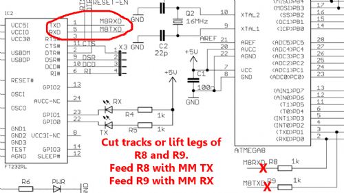 Going back to my last post, we need to link the MM and Arduino directly via a serial connection. Thanks to Mick we can now see that no Arduino code needs changing (which was your fear) as the serial connections for the Arduino that we require are available with the aid of a soldering iron. Not 100% convinced you need to cut tracks though. Personally I would just solder a wire onto the MBTXD resistor for now - see below . . . One word of warning - IF you do have the version of unit as in Mick's post, you can't necessarily go by the PCB silkscreen on your unit and look for R9 (ignore the other signal - R8, as I don't think you need it). IF your unit is a 'clone' then there is a very good chance that the required resistor (R9 in the circuit diagram) will be labelled as something else on your unit. So with your unit, I would go to the FTDI chip (FT232RL or similar - assuming it has one!!) and follow back from Pin 5 ensuring it passes through a resistor (the ones labelled R9 in the circuit diagram above). Make sure that the track traces back to the Atmega to Pin 3 as a sense check. Then the FTDI pin 5 (MBTXD in circuit diagram) I would simply solder a small wire onto the FTDI side of the resistor. All of this is just to ensure you have the correct connection from the Arduino (the Arduino Tx line). This is then connected to the MM COM1 Rx line. Finally take a ground from each unit and simply connect together - result is just two interconnections JOB DONE