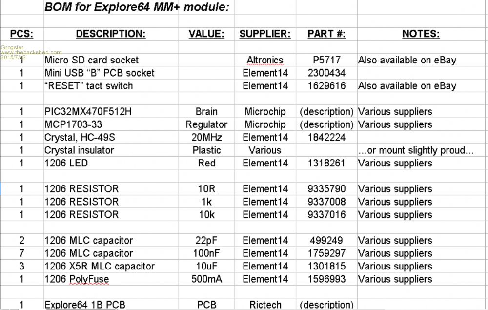 Here's a BOM with Mouser, Newark and Element14 part numbers. Newark and Element 14 are the same place, so maybe the Newark numbers are US? A few parts in Newark's catalog are only stocked in the UK. Could be right now or indefinitely. Dunno. Not all Mouser parts are the same vendor as Newark but they are equivalent. The only other special part is the Hirose mini USB B socket: it's available at both Newark and Mouser. I couldn't find the same SD socket at Mouser but I did find it on eBay. Micro SD card socket Altronics P5717 Mini USB B socket, short (Hirose UX60SC-MB-5ST(80)) Mouser 798-UX60SCMB5ST01 Newark 69W0710 Element14 2300434 [UK only for Newark] Reset switch (E-switch TL3302BF180QG) Mouser 612-TL3302BF180QG (or 506-FSMSM) Newark 15N4506 Element14 1629616 PIC32MX470F512H Mouser 579-32MX470F512HIPT Newark 49X0835 [UK only for Newark] MCP1703-33 Mouser 579-MCP1703-3302E/DB Newark 09P3988 [UK only for Newark] Crystal 20mhz HC-49S Mouser 717-9B-20.000MAAJ-B Newark 84R5813 Element14 1842224 Crystal insulator KINGBRIGHT LED, RED, 1.6MM X 2MM, 230MCD, 630NM 1206 (KPC-3216SURCK) Mouser 710-150120RS75000 Newark 31M5204 Element14 1318261 10 ohm resistor 1206 Mouser 660-RK73H2BTTD10R0F Newark 94W6473 Element14 9335790 1k ohm resistor 1206 Mouser 660-RK73H2BTTD1001F Newark 39K0993 Element14 9337008 [UK only for Newark] 10k ohm resistor 1206 Mouser 660-RK73H2BTTD1002F Newark 39K0994 Element14 9337016 [UK only for Newark] 22pf MLCC cap 1206 Mouser 77-VJ1206A220KXACBC Newark 96K4783 Element14 499249 0.1uf/100nf MLCC cap 1206 Mouser 77-VJ1206Y104KXQPBC Newark 90W2887 Element14 1759297 10uf X5R MLCC cap 1206 Mouser 77-VJ1206G106KXYTBC Newark 84K8407 Element14 1301815 Littlefuse 6v 500ma PTC Reset 1206 (1206L050YR) Mouser 576-1206L050YR Newark 53M6118 Element14 1596993 |