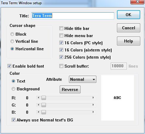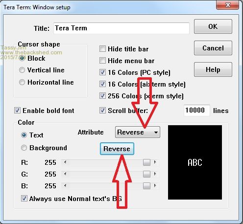 Thanks Jim, That helped a lot, we differed on this section: [code] ; for Reverse characters EnableReverseAttrColor=on VTReverseColor=255,255,255,0,0,0 ; Solarized Dark [/code] I copied yours as above to mine, saved, restarted TeraTerm and so far it is working fine with a White Background and Black text and Reverse Highlighting. There were a couple of other differences but not related to colour so I ignored them. For others that may have an issue here is my ini file: 2015-07-24_081946_TERATERM.INI.zip and a screen shot with text Selected: