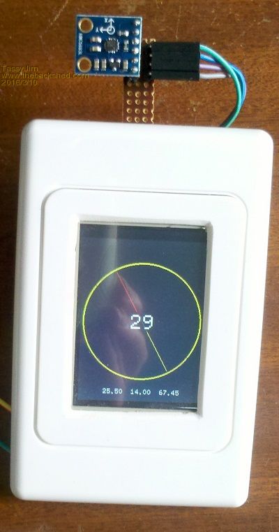 I re-read your post. If I keep the sensor in the same location, it behaves correctly but if I hold the display in the same location and therefore move the sensor around in a circle, I get strange results. This is because I am too close to mag fields. A long power lead and standing in the clear will work better. Keeping it level makes a difference too. The 'case' is a blank electrical power outlet. I don't have the luxury of a CNC miller but the Dremmel and a shaky hand does a reasonable job of cutting the opening. This version uses what I think is the correct scaling factors: ' OPTION LCDPANEL controller, orientation, D/C pin, reset pin [,CS pin]