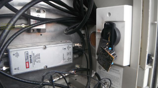 Hi folks. @ Phil: I was about thirty meters away from the main strike, and outside at the time, but under a car canopy outside a reception. Receptionist inside insists she saw a big blue lightning bolt shoot over the top of my head, but still under the canopy. I do not recall seeing that, and certainly did not feel any kind of contact with the discharge at all, so I am not sure if she was imagining that or not. I said it was probably my electric personality. ![]() The main strike about thirty meters away was GIGANTIC - the biggest lightning strike I have ever seen in my life thus far. .....and it was EXTREMELY loud. Lots of people thought it was a bomb. It shook most of buildings in the area, and made windows rattle etc - it was a huge discharge. Some more carnage photos for you then: End blown off RG11 cable-TV feed cable - this was one block of buildings over from where the main strike was. ![]() An outlet in one of the rooms: ![]() Another TV distribution box out in the field: ![]() Another shot of the amp PSU carnage: ![]() Nursecall system mainboard: ![]() If these photos are of any interest to people, I will keep posting them as I discover damage, but I guess after a few photos, they all start to look the same eh? Smoke makes things work. When the smoke gets out, it stops! |