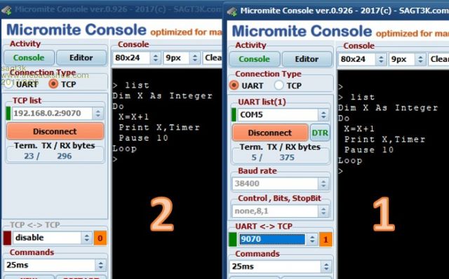 Hi In this example, there are 2 sessions of MicromiteConsole. 1) The first is connected to the COM(12) port with a Micromite64 and put in the TCP/server port 3031 the serial, such as ser2net. 2) In the second session of "MicromiteConsole" a connection to the TCP/3031 port is active and in addition, a script that reads the TCP buffer and prints on the output of the script module. ![]() |
