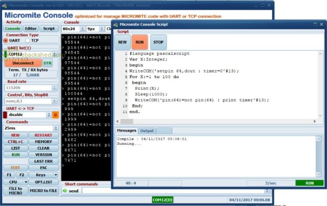 Hi to Everybody I announce that I will soon release a new version with a new feature, I've integrated a script engine, now with 2 languages "Basic" and "Pascal". You can create scripts that can interact with the open console, as an example to write or read the UART or the console via TCP. This allows you to create datalogs, report views, data exchange, etc. If anyone is interested in something that I can implement, let me know. Thanks Antonio ![]() ![]() |