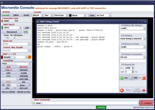 Hi Mike I use to send the commands so: send "CTRL+C" (0x03) wait 25ms send "<command>" wait 25ms You can set wait in ms from the combobox in the left under label "Commands". Default is set at 25ms. >>I'll get screen grab of the Console contrast when I get a chance.<< Here I need an visual example. Thanks sagt3k |