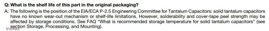 Vishay comment on shelf life of tantalum capacitors: You may check them on leakage, but good chance they are still good after 40 years. PicomiteVGA PETSCII ROBOTS |