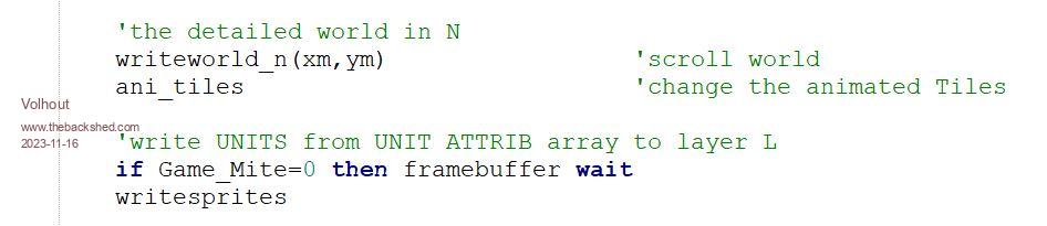 Hi Kevin, Thank you for your explanation. I was afraid this would be your reasoning, and hence my worries. Let me explain. In the game loop there are functions and subs that work on background data, and subs that actually write to the screen. Sometimes the name of the subs can be confusing (due to my personal development in writing games, I sometimes changed the content (and thus function) of a sub. And it not always exactly does what it's name says (i.e. writeplayer does not actually write to ecreen anymore). In the game main loop, all screen (either VGA or LCD) activity (block screen write routines) takes place here: writeworld_n: copies section of the world map to N layer in the view window. writesprites: clears L layer and redraws all sprites. subs like "ani-tiles" and "writeplayer" prepare data for the actual screen writing routines, but do not actually write. The only exemption to the above is the data that is written in the game border on layer N. The weapon/item/key/player face/comments are directly written to N, only when changed. And the loop time indicator in the top right, is written each loop. Now about your change. Since you have not changed the order in which writeworld and writesprites work, you have not fixed what you intended to fix. But you did change the timing relation in the loop between the block screen write routines, and the "incidental" screen write routines that show weapon/item/player_face/comment strings and loop time. Regards, Volhout P.S. I was able to lower the loop time by 10ms by re-organizing the "scan_units" SUB. Hooray... now we can add the missing things. Edited 2023-11-16 21:49 by Volhout PicomiteVGA PETSCII ROBOTS |