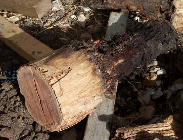 Sitting on black mud here, that expands & contracts like crazy. Walking thru the place back then involved a few leans & climbs. Even sitting on the new stumps, there are a couple of doors where the top jam can open to almost an inch with the weather change. Even the new foundation don't make it down to rotten rock. Apparently that's about 25' down in this area, according to a well next door. One of the old stumps that came out; looked good above ground level.... Phil. |
