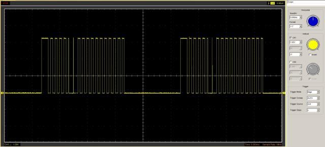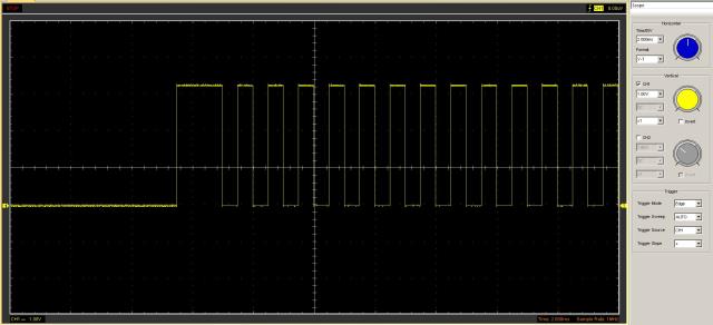 Agreed... I presume it's how the register is first loaded and the way the PWM is initialised. Run this code, BaseHz=1000'1249 for j = 1 to 500 for i = BaseHz to 1300'(BaseHz+20) pwm 1, i, 50 pause 5 next i pwm 1, stop pause 10 next j pwm 1, stop pause 1000 ... and you get this... When it periodically shows up, it's always a wide pulse on the first cycle (similarly at the other end, there's often a narrow pulse on the last one - presumably that's depending on when the PWM is turned off). The set frequency is perfect from the falling edge of the wide pulse to the next falling edge. Not a big deal for my situation, but could be an issue trying to control servos when they need a precise mark/space. John |