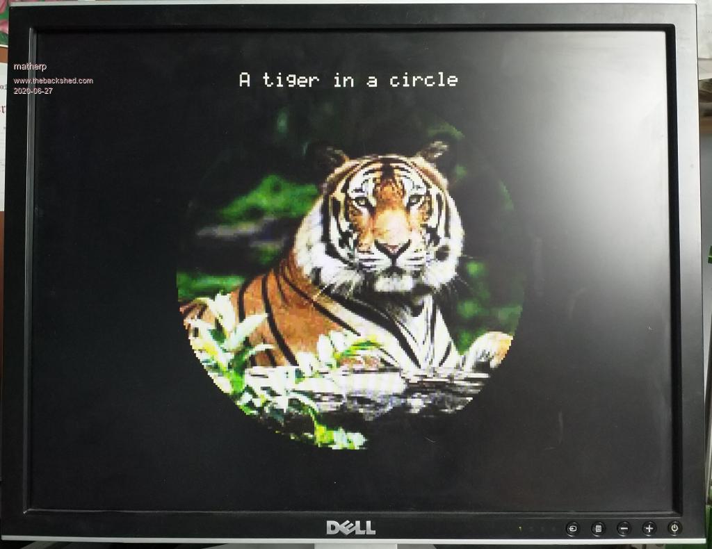 To do this in a generic fashion comes into the "too hard" category but I've been thinking about this one and have a fun answer Try the simple program below. You can substitute the LOAD JPG with any output you want clipped. mode 3,12 page write 1 cls rgb(black,15) 'set the page to solid black text mm.hres\2,0,"A tiger in a circle",CT circle mm.hres\2,mm.vres\2,90,,,rgb(black),rgb(black) ' draw a circle in transparent black page write 0 load jpg "tiger-320" do:loop I'm also thinking about implementing a chroma-keyed BLIT which could allow some interesting effects |