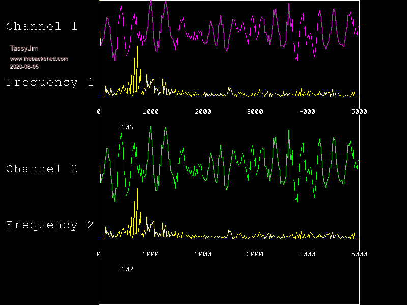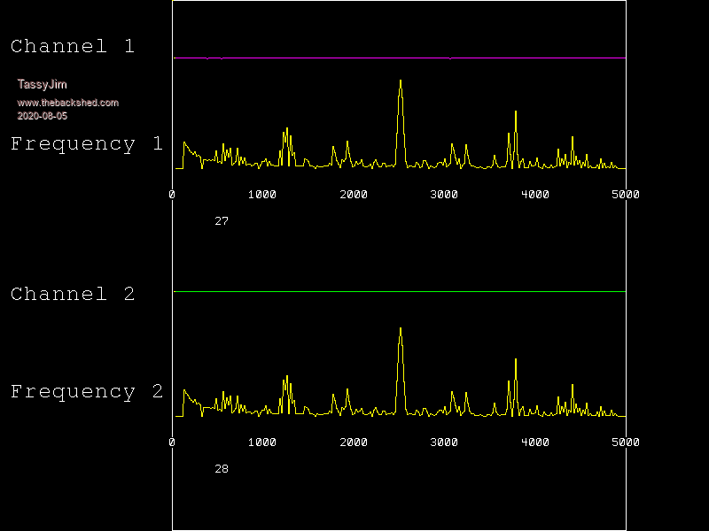 I know you have checked the wiring but can we do a test. Connect the audio left and right audio to pins 7 and 8 It doesn't matter which go where at this stage. Run this program: SETPIN 7, AIN SETPIN 8, AIN DAC 1, 0 DAC 2, 0 PRINT "Left ";STR$(PIN(7),3,2);" Right ";STR$(PIN(8),3,2) DAC 1, 1.65 DAC 2, 1.65 PRINT "Left ";STR$(PIN(7),3,2);" Right ";STR$(PIN(8),3,2) DAC 1, 3.3 DAC 2, 3.3 PRINT "Left ";STR$(PIN(7),3,2);" Right ";STR$(PIN(8),3,2) DAC 1, 1.65 DAC 2, 1.65 do:loop The output should be similar to this: Left 0.02 Right 0.03 Left 1.66 Right 1.65 Left 3.29 Right 3.29 If not, there is a wiring problem. Next, using Peters FFT demo, slightly modified. Run this program with the audio pins still connected to pin 7 and 8 OPTION EXPLICIT OPTION DEFAULT NONE OPTION VCC 3.308 CONST SAMPLESPERSEC = 10000 CONST NSAMPLES = 512 CONST PLOTFREQ = NSAMPLES\512 DIM INTEGER i, j, imax, imax1, toggle DIM FLOAT a(NSAMPLES-1) , b(NSAMPLES-1), a1(NSAMPLES-1), b1(NSAMPLES-1) DIM INTEGER c%(179), d%(179),x1(255),x2(255),y1(255),y2(255),y3(255), y4(255) DIM FLOAT m(NSAMPLES-1) , mmax , m1(NSAMPLES-1), mmax1,p DIM k$ CLS FOR i=0 TO 255 x1(i)= i*2+194 x2(i)= i*2+195 NEXT i ' ' First set up some signals using the onboard DAC playing music ' connect PA4 to pin 7 and PA5 to pin 8 ' ' start the DAC ' 'PLAY MP3 "noise" 'play tone 1000,2000 'play volume 30,30 ' ' convert the signals ' toggle=1 PAGE WRITE 1 CLS ADC OPEN SAMPLESPERSEC, 7, 8,, adc_done ADC START a(), b() TEXT 10,40,"Channel 1",,3 TEXT 10,150,"Frequency 1",,3 TEXT 10,320,"Channel 2",,3 TEXT 10,430,"Frequency 2",,3 DO DO LOOP WHILE j=0 j=0 IF toggle THEN ADC START a1(),b1() toggle=0 ELSE ADC START a(),b() toggle=1 ENDIF ' ' frequency analyse the signals ' IF MM.INFO(VERSION)>=5.0504 THEN IF toggle THEN MATH FFT MAGNITUDE b1(),m() MATH FFT MAGNITUDE a1(),m1() ELSE MATH FFT MAGNITUDE b(),m() MATH FFT MAGNITUDE a(),m1() ENDIF ELSE IF toggle THEN FFT MAGNITUDE b1(),m() FFT MAGNITUDE a1(),m1() ELSE FFT MAGNITUDE b(),m() FFT MAGNITUDE a(),m1() ENDIF ENDIF BOX 194,0,MM.HRES-287,MM.VRES,1,&HFFFFFF,0 FOR p = 0 TO 512 STEP 102.4 TEXT 194+p,500,STR$(INT(p*9.765625)),cm TEXT 194+p,220,STR$(INT(p*9.765625)),cm NEXT p ' ' remove the upper and lower values ' FOR i=1 TO 5 m(i)= 0 m1(i) = 0 m(NSAMPLES\2-i)= 0 m1(NSAMPLES\2-i) = 0 NEXT i ' ' find the maximum magnitude of the frequencies ' mmax=0 mmax1=0 FOR i=1 TO NSAMPLES\2-1 IF m(i)>mmax THEN mmax=m(i) imax=i ENDIF IF m1(i)>mmax1 THEN mmax1=m1(i) imax1=i ENDIF NEXT i ' ' plot the samples ' FOR i=1 TO 255 IF toggle THEN y1(i)=130 - a1(i-1)*40 y2(i)=130 - a1(i)*40 y3(i)=410 - b1(i-1)*50 y4(i)=410 - b1(i)*50 ELSE y1(i)=130 - a(i-1)*40 y2(i)=130 - a(i)*40 y3(i)=410 - b(i-1)*50 y4(i)=410 - b(i)*50 ENDIF NEXT i LINE x1(),y1(),x2(),y2(),1,RGB(MAGENTA) LINE x1(),y3(),x2(),y4(),1,RGB(GREEN) ' ' plot the frequency analyses ' FOR i=2 TO 255 y1(i)=470-m((i-1)*PLOTFREQ)/mmax*100 y2(i)=470 - m(i*PLOTFREQ)/mmax*100 y3(i)=190-m1((i-1)*PLOTFREQ)/mmax1*100 y4(i)=190 - m1(i*PLOTFREQ)/mmax1*100 NEXT i LINE x1(),y1(),x2(),y2(),1,RGB(YELLOW) LINE x1(),y3(),x2(),y4(),1,RGB(YELLOW) TEXT 250,530,STR$(INT(mmax)),cm TEXT 250,250,STR$(INT(mmax1)),cm PAGE COPY 1 TO 0 k$ = INKEY$ LOOP UNTIL k$ <> "" IF k$ = "P" OR k$ = "p" THEN SAVE IMAGE "CRO"+MID$(TIME$,1,2)+MID$(TIME$,4,2)+MID$(TIME$,7,2)+".BMP" ' PLAY STOP END SUB adc_done j=1 END SUB Pressing 'P" will grab a copy of the screen and end the program. Playing the audio from your MP4, gives this output: ![]() Once the audio has stopped, this is what I get. ![]() The FFT (yellow) is auto-scaling so any background noise is dramatically amplified when there is no audio playing. The number below the frequency scale is the amplitude of the spectrum. Some of the spectrum is due to artifacts, some will be actual noise, none of which I can hear. Post a coy of your results. Jim VK7JH MMedit |
