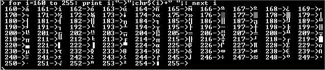 Oops, right--TeraTerm. I think puTTY worked also. They are single-byte box-drawing characters, with TeraTerm set in VT100 mode. Yikes, the code? This is in C code compiled into MMBasic DOS, a project put on the back shelf some months ago, with output to a usb/serial module (the same one (or two of them rather) that you posted about a few days ago). But on an Armmite F4 (CMM2 not available to me now), and Teraterm in VT100 mode, this lists what's available: for i=160 to 255: print i,chr$(i): next i Or, more compactly: for i=160 to 255: print i;"->";chr$(i)+" ";: next i ![]() Edited 2021-02-17 05:35 by lizby PicoMite, Armmite F4, SensorKits, MMBasic Hardware, Games, etc. on fruitoftheshed |