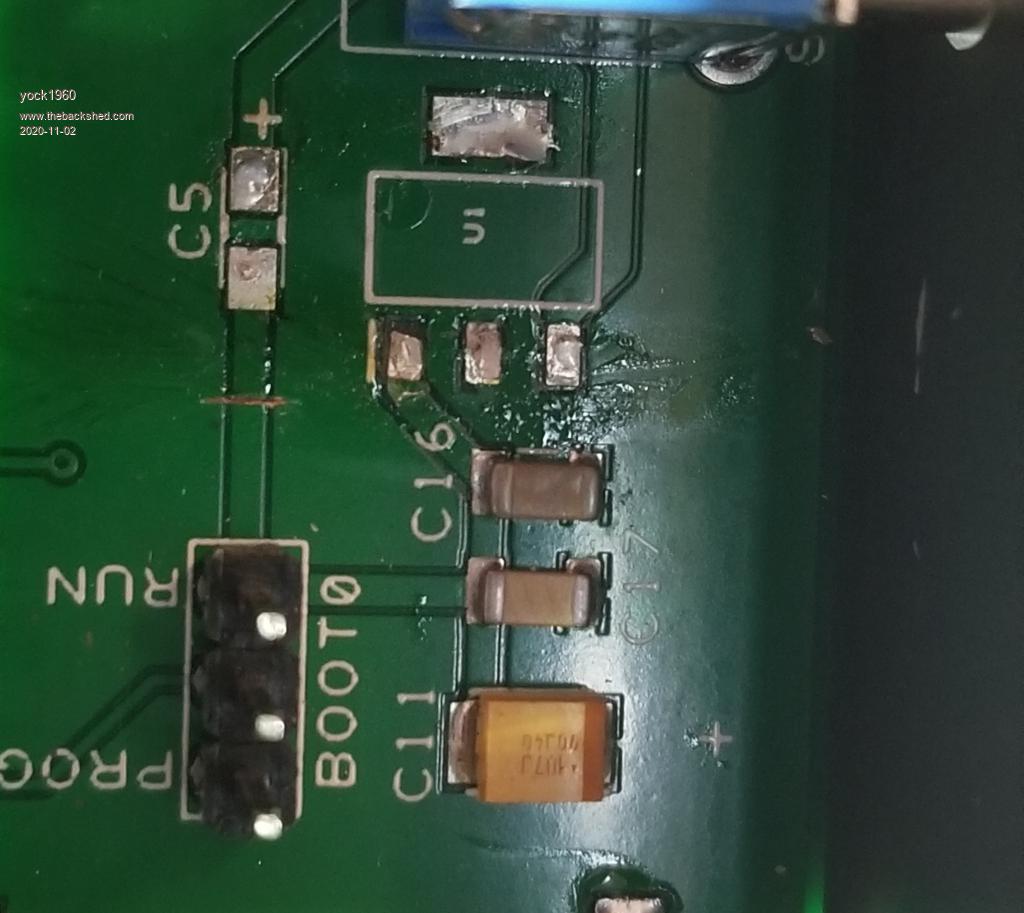 Hi Yock, All, I would be extremely careful with the damaged pad as it is the GND pin and the top layer cooper pour is actually on Vcc. If it was me I would cut the pad away so there is no loose track or pad even left. Then solder an LED wire or stiff single core wire from the leg of the replacement Vreg to the side of C16 that the trace would have gone to. Making sure there is no possibility of shorting to the copper pour area..USE A METER to test that the fix is clear of the vcc pour. I would offer to repair it for you but it would be expensive to ship 2 ways and probably a good month turn around.. But I will do it for you if you wish. Regards, Mik Mick's uMite Stuff can be found >>> HERE (Kindly hosted by Dontronics) <<< |