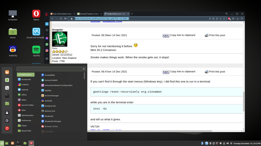 ctrl_alt-T will open a terminal for you. Not sure what you can do about the missing taskbar. I still haven't worked out what flavour of Mint you are running. The 'windows' key opens the start menu. Jim Edited 2021-12-14 16:44 by TassyJim VK7JH MMedit |