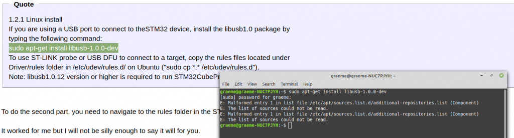 hi grogster, have you done BOTH of: echo 'SUBSYSTEM=="usb", ATTRS{idVendor}=="0483", ATTRS{idProduct}=="df11", MODE="0664", GROUP="plugdev"' | sudo tee /etc/udev/rules.d/45-stdfu-permissions.rules > /dev/null (as a single line), AND: sudo adduser $USER plugdev just cut (from this message) and paste each of the lines into a command terminal. both are CASE SENSITIVE, and both will prompt for your password. the purpose of the first line is to create a file called /etc/udev/rules.d/45-stdfu-permissions.rules containing the one line of text: SUBSYSTEM=="usb", ATTRS{idVendor}=="0483", ATTRS{idProduct}=="df11", MODE="0664", GROUP="plugdev" this allows access to the VDI/PID 0483:df11. cheers, rob :-) |