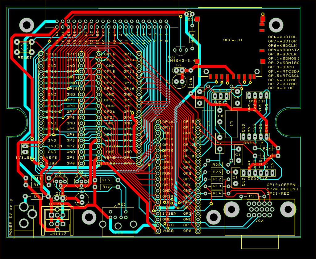 @Peter Some other notes for the pico VGA board release 2.0 1/ Since VGA is THE feature of this board, I would suggest to cut the VGA connections from the main pico to the shadow footprints and the 40 pin header. Especially when you plug in a ribbon cable into the 40 pin connector you start seeing artefacts in the video. You can leave the connection between the 2 shadow footprints intact (this may come in handy if you put a second pico in), as well as the 40 pin header. Just cut of the live video signals and syncs from it. 2/ The TC1264 footprint may get an alternate footprint (i.e. LM1086-33 and LM1117-33). For the rest I have found not obstacles in building it (except I did not purchase the correct SD card header, and hand wired a SD-uSD convertor as a uSD connector on the board. But that was pure me .. ordering the wrong part. Volhout PicomiteVGA PETSCII ROBOTS |