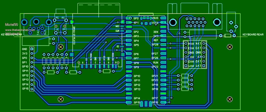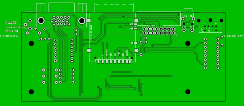 Here's an idea. You are looking up from the bottom of the keyboard. The PS/2, VGA, power & audio sockets are on the top (the other side) of the pcb. The PicoMite and SD card are surface monted on the bottom (facing you). The pcb is fastened to the bottom of the keyboard using the fixing holes, with the sockets projecting from the back. That adds about 19mm maximum to the back of the keyboard. The PS/2 skt could be left off and the wire cut and soldered on, but I think plugging it in is better. You can simply remove the PCB and just leave 4 little holes. You need 8mm height 40mm in from the back of the keyboard. Incidentally, the projection of the actual PCB behind the keyboard is only 13mm. The 19mm dimension includes the full depth of the VGA socket. Edited 2022-04-30 03:52 by Mixtel90 Mick Zilog Inside! nascom.info for Nascom & Gemini Preliminary MMBasic docs & my PCB designs |