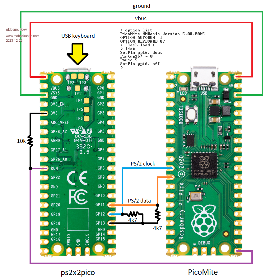 Thanks Mick! I've implemented a similar solution using the run pin, but am searching for a hardware power on reset for the ps2x2pico to avoid tying up a pin on the picomite to do the reset. So far, my tinkering around with adding a cap and pullup to run have not worked :/ This solution is fully working for me: |