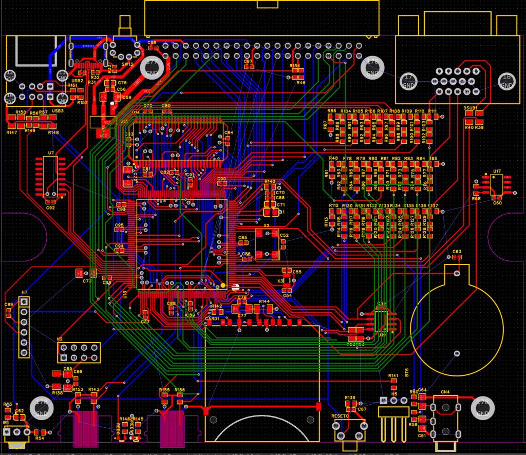 Harm It isn't a crystal but a crystal oscillator package which is what fixed the issue for the original CMM2. The CMM2 G2 is a 4-layer board with a complete ground plane as the second layer - always has been - there is no way it could be routed with two layers. Noise could conceivably affect the 32KHz crystal but that is supplemented with the DS3231 RTC so the time is reset regularly. Unfortunately the way the STM32H7IIT6 pinouts works means that it is inevitable that you ware going to have wires all over the place Current state of the layout without the GND and VCC planes and about 6 wires left to route. As you can see, there is very little near the crystal oscillator or 32KHz crystal. Red - top, blue - botttom, green - VCC layer. No routing on the GND layer ![]() Edited 2024-02-26 18:31 by matherp |