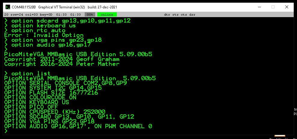 This is the same symptom I had for one of my 5 boards--the other 4 tested OK for everything I tried--console through USB_C with TeraTerm (didn't need to set baud rate because I'd previously had PicoMites given the same COM port which were set at 115200), VGA, SD, keyboard--haven't tried audio (should headphones work?). For the faulty board, per BigMik's and Peter's suggestions, I found that R31 was 2k8 instead of 5k1 (I tested a working board and it was 5k1). I don't know if this might be your problem (or even if it actually is the cause of my fault), but it might be something worth testing. Do all of your PCBs fail to present console on the USB_C? I flashed using the USB_A to USB_A port, and then removed that and plugged in the USB_C cable. If the pico was previously flashed with a prior version of the firmware, did you try erasing it? PicoMite, Armmite F4, SensorKits, MMBasic Hardware, Games, etc. on fruitoftheshed |