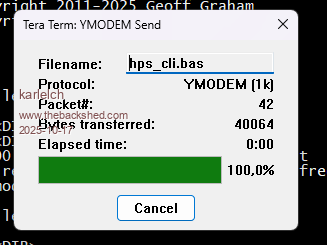 and in TeraTerm (v5.2; Windows 11) I started file/transfer/ymodem/send and selected a file on my PC. TeraTerm indicated a transfer but then it stopped at 100% and nothing happens.