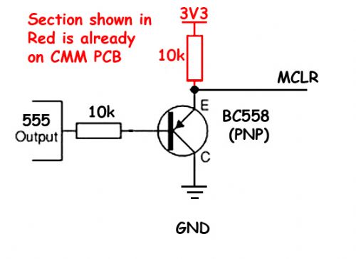Hi Groggy, A pleasure mate... Did you move the cap to the Transistor side? (I think it would be better there)... And I just took a guess at a suitable start value... On your observations I would probably go with 220-470nf... Try adding a 22k resistor from the 555 output to the input of the 555 cct to re-trigger the count... This value cant be too low else the MCLR line will fall below its trigger level (10k UP with 22k down) and will cause the PIC to reset every time the input gets pulsed... Regards, Mick Mick's uMite Stuff can be found >>> HERE (Kindly hosted by Dontronics) <<< |