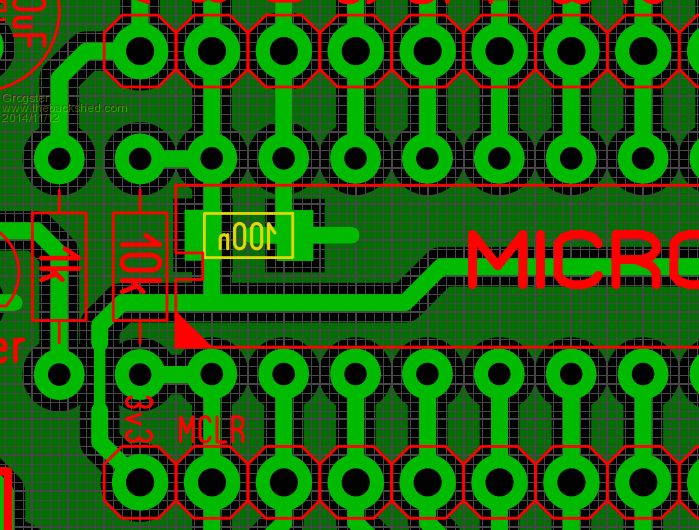 Hi Cliff. The PIC32 and headers are all standard 0.1"/2.54mm pin spacing, but the underlying grid is 0.3175mm, in order to squeeze everything in, and still allow for neat track layout. So, if you use a 2.5 grid, you WILL NOT be able to design a daughter-board to fit. However, if you use a 0.3175 grid, you will have no problems at all with spacing. All PCB layout software allows you to change the grid size, and most of them let you change it on the fly. Standard practise is to stick to one grid size, but in this case, I have changed grid sizes depending on what I needed to factor in. However, the PIC32 chip, and the header strips either side, are on a common grid - that being 0.3175mm. Example: