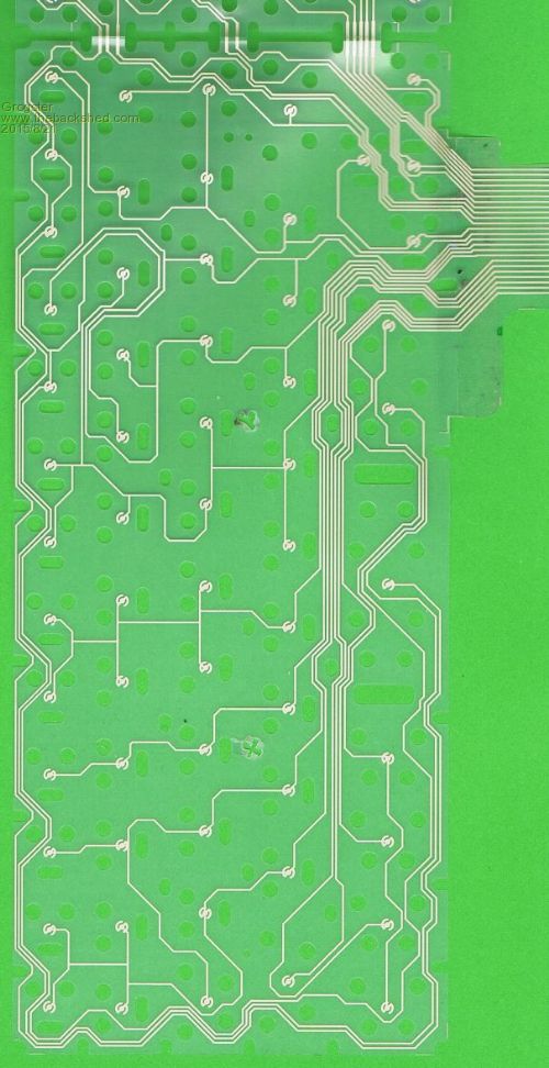 From what I can see, it would appear to be a 8 x 16 matrix, with the eight on the top layer, and the 16 on the bottom. The hand-written chart above lists the keycode connections in the CODE column, in a BOTTOM LAYER,TOP LAYER format. Therefore, the ENTER key is CODE 12,20 - meaning lines 12 and 20 will give a closure if ENTER is pressed. There is a normal resistance on this matrix ranging from about 50R through to about 350R for the longest traces. EDIT: The chart is missing one data point for the ':' key - it should read 12,18. Pin '1' is the trace closest to the writing on the FPC cable: 'HASKEY.....' etc. Smoke makes things work. When the smoke gets out, it stops! |